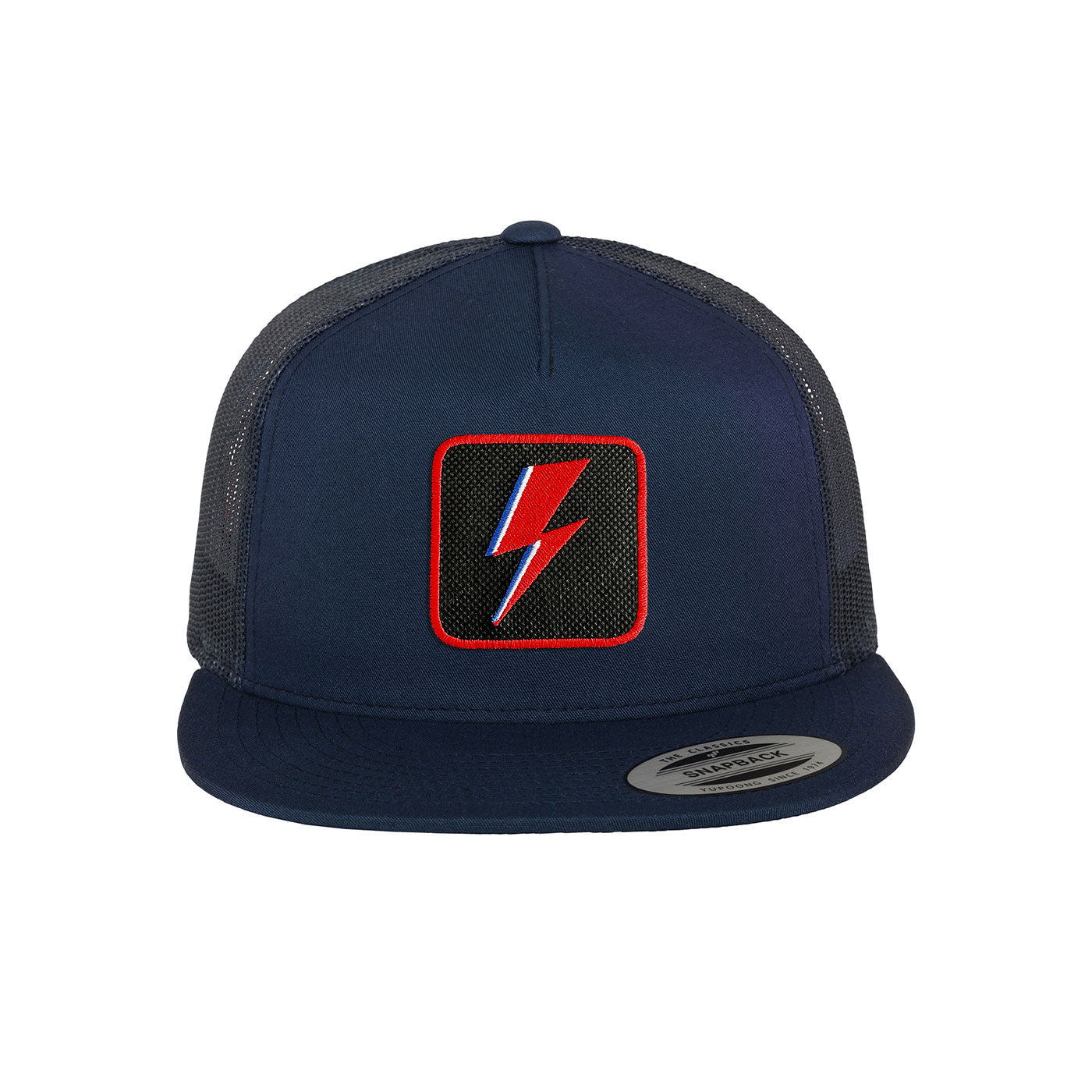 Introducing the Bowie Flash Trucker with an embroidered patch, available in black, white, grey. Perfect for music lovers, this cap allows for easy customization and adds a touch of vintage flair to any outfit. Embrace nostalgia with this stylish and versatile accessory.