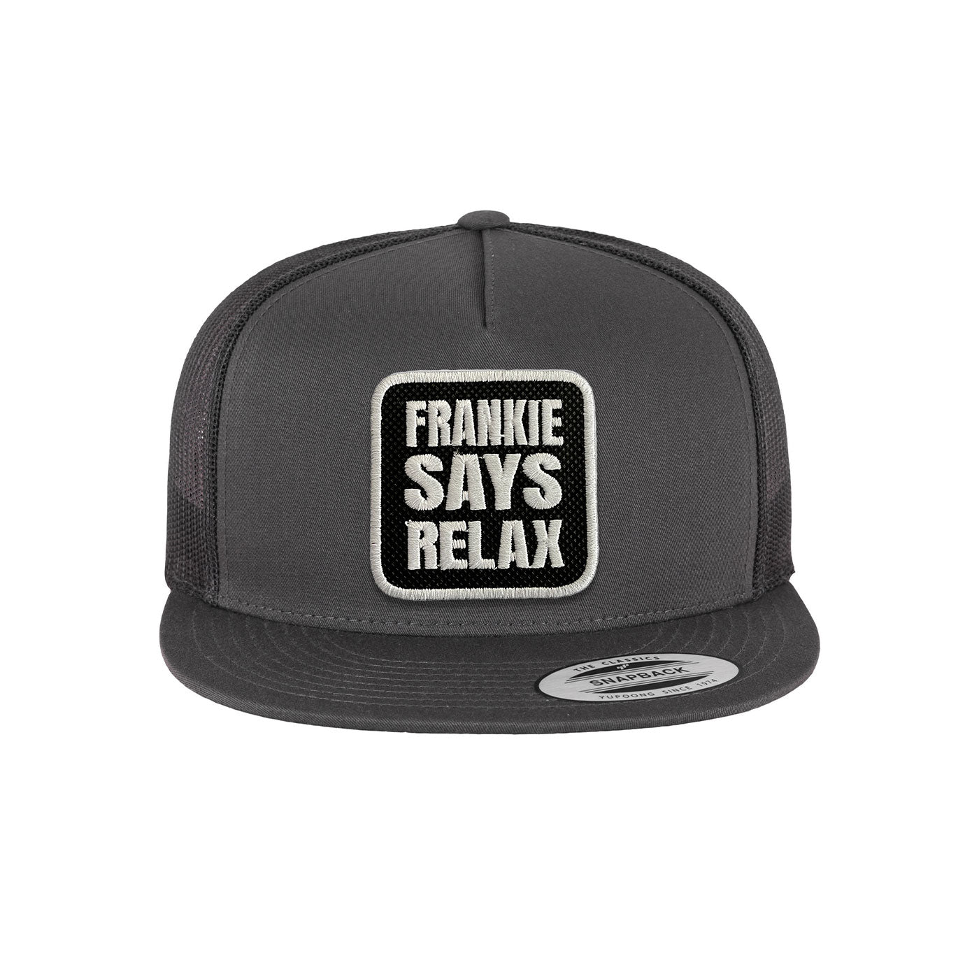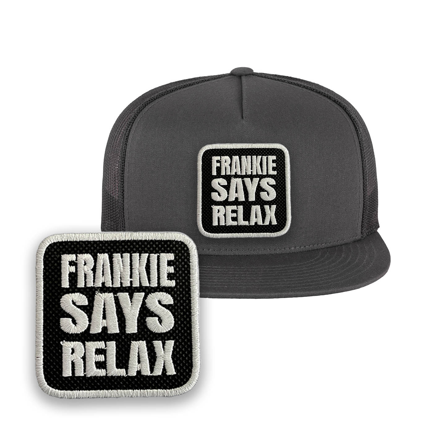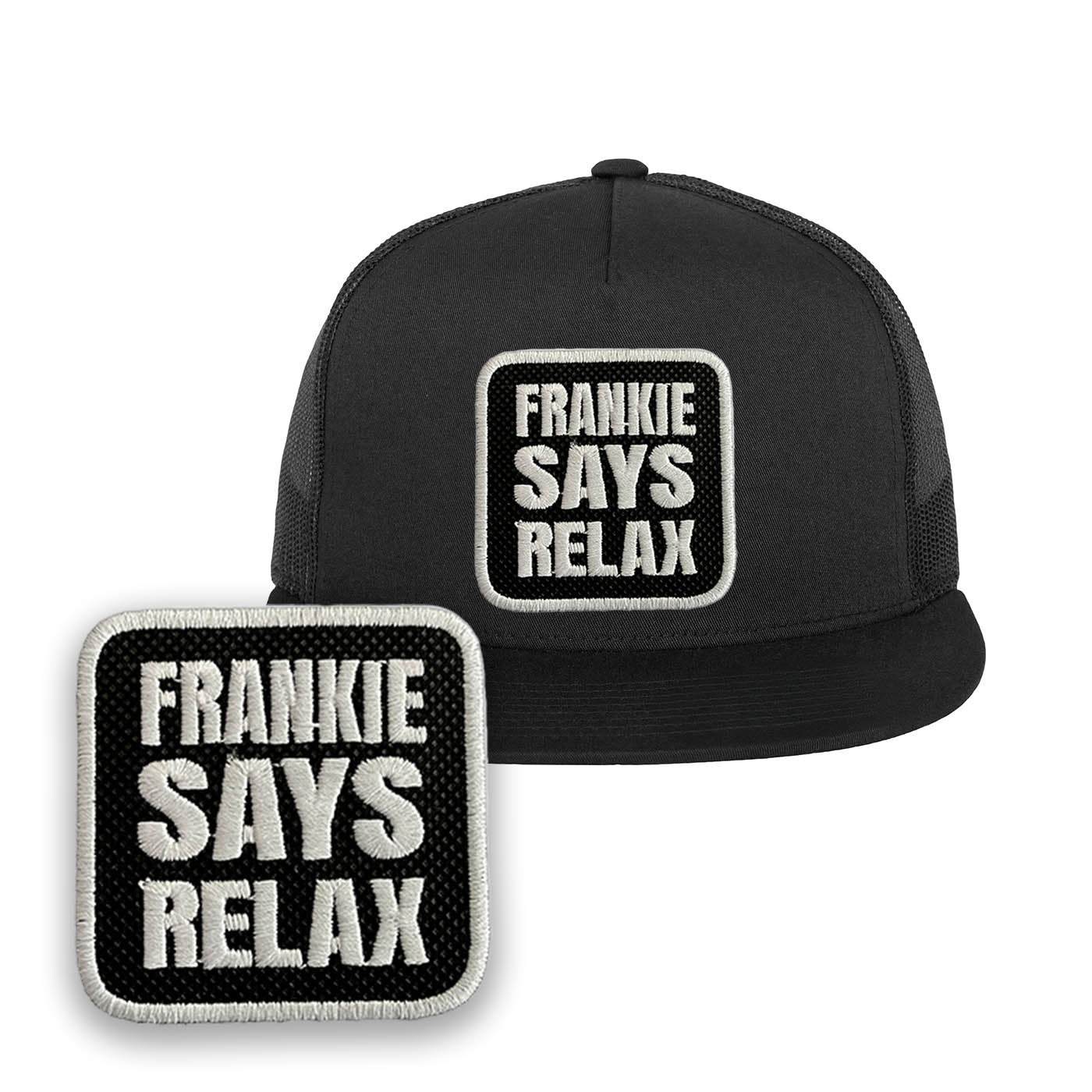 Introducing the Frankie Says Relax Trucker Hat with an embroidered patch, available in black, white, grey. Perfect for music lovers, this cap allows for easy customization and adds a touch of vintage flair to any outfit. Embrace nostalgia with this stylish and versatile accessory.
