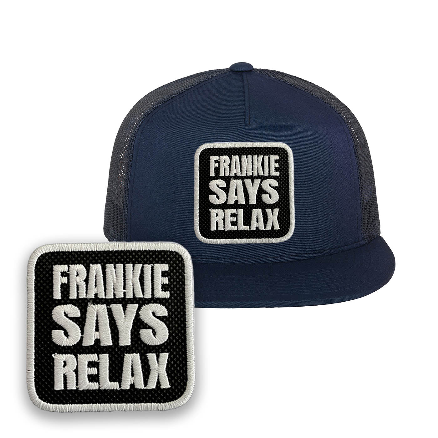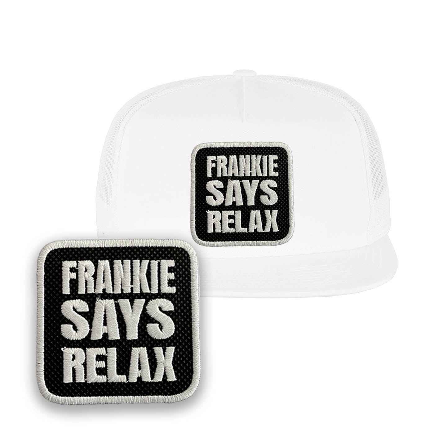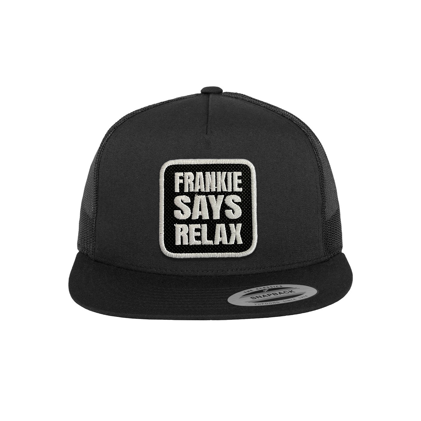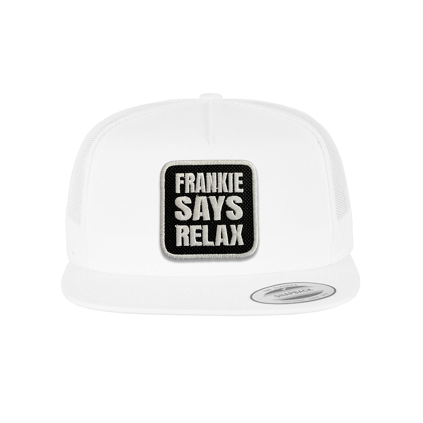 Introducing the Frankie Says Relax Trucker Hat with an embroidered patch, available in black, white, grey. Perfect for music lovers, this cap allows for easy customization and adds a touch of vintage flair to any outfit. Embrace nostalgia with this stylish and versatile accessory.