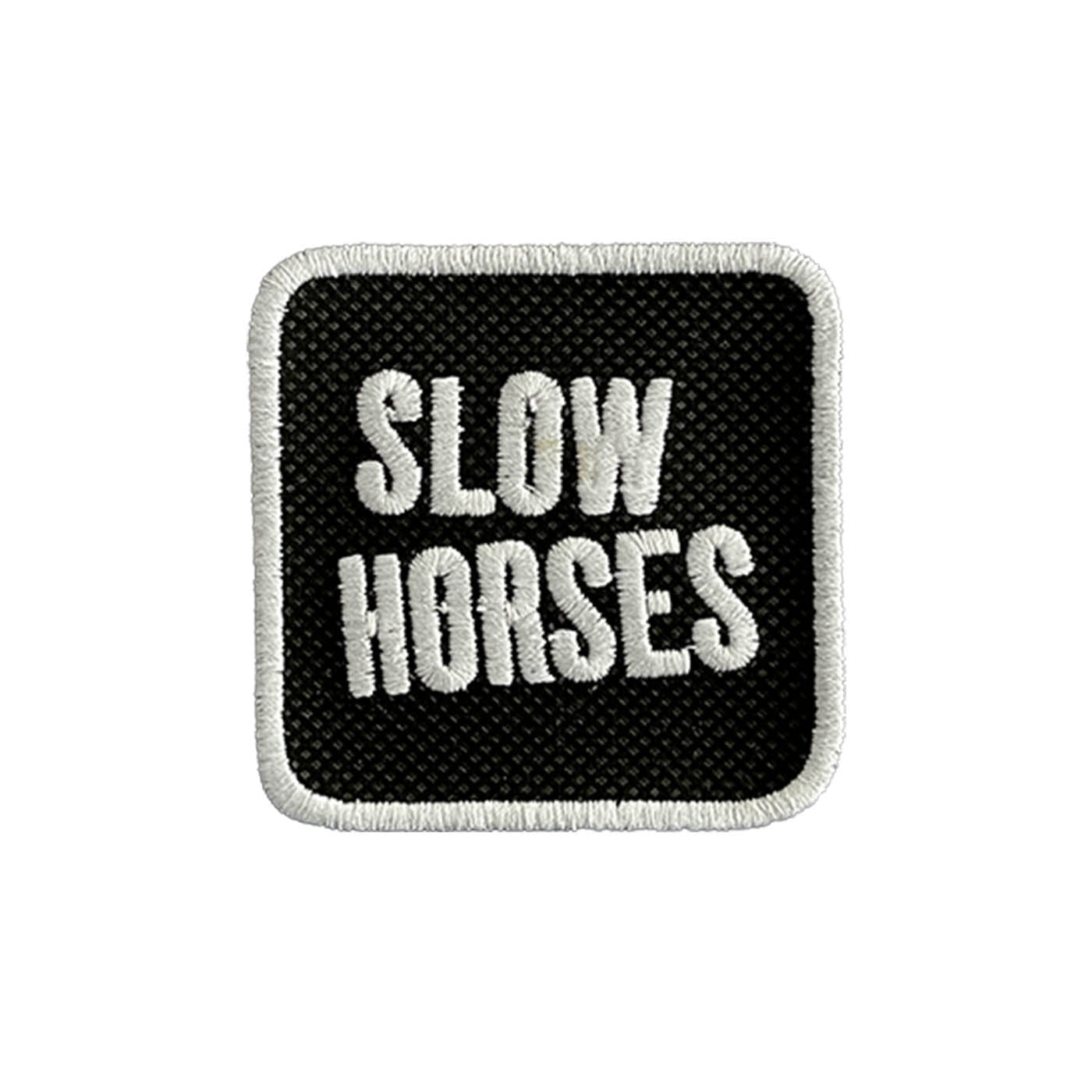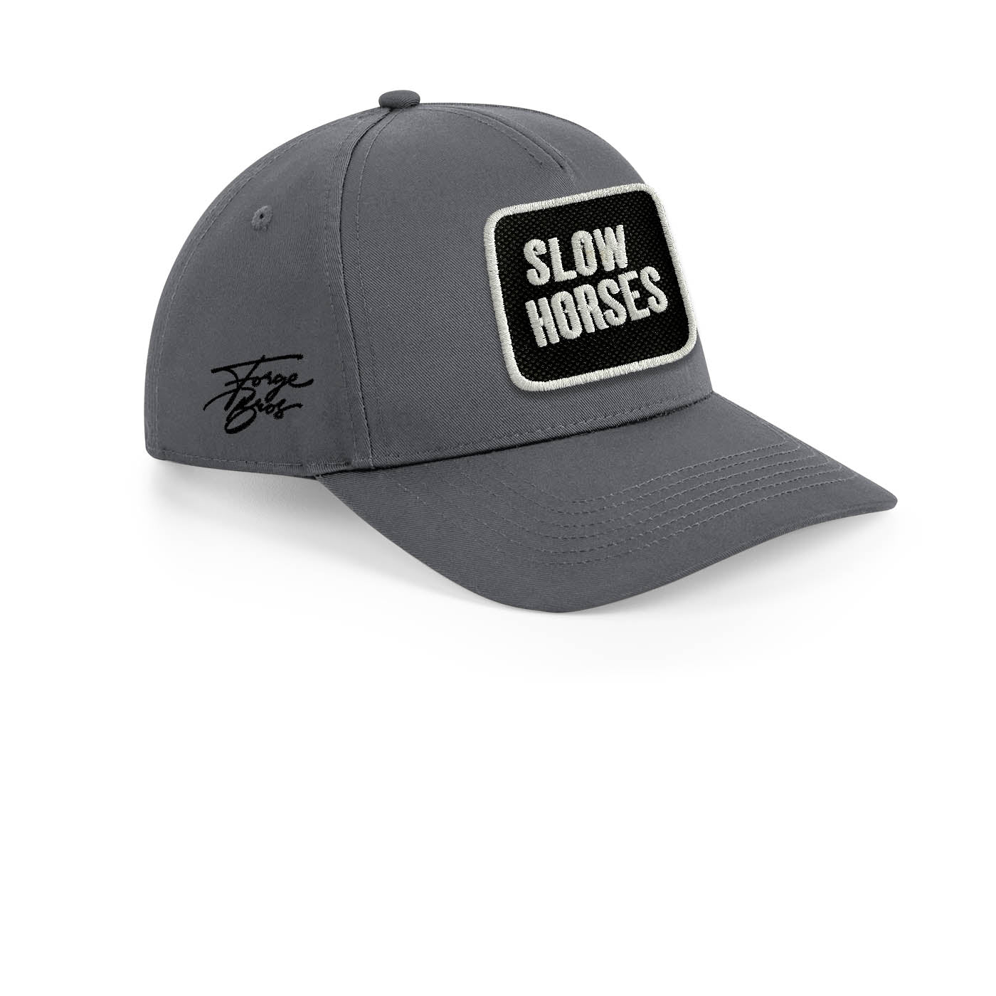 This black, white, and grey cap features embroidered patches with a Slow Horses design.